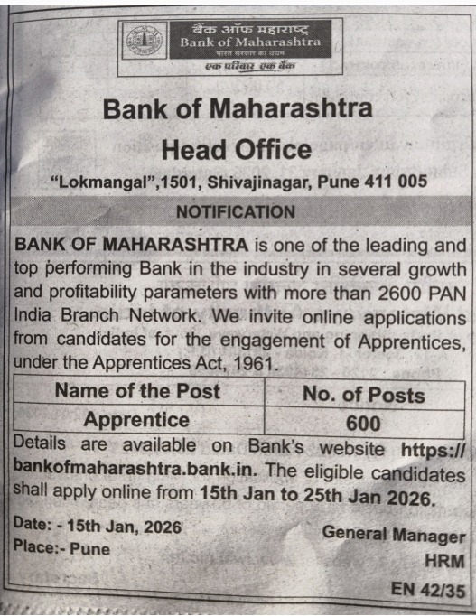 - बैंक ऑफ महाराष्ट्र Apprentice भर्ती 2026
