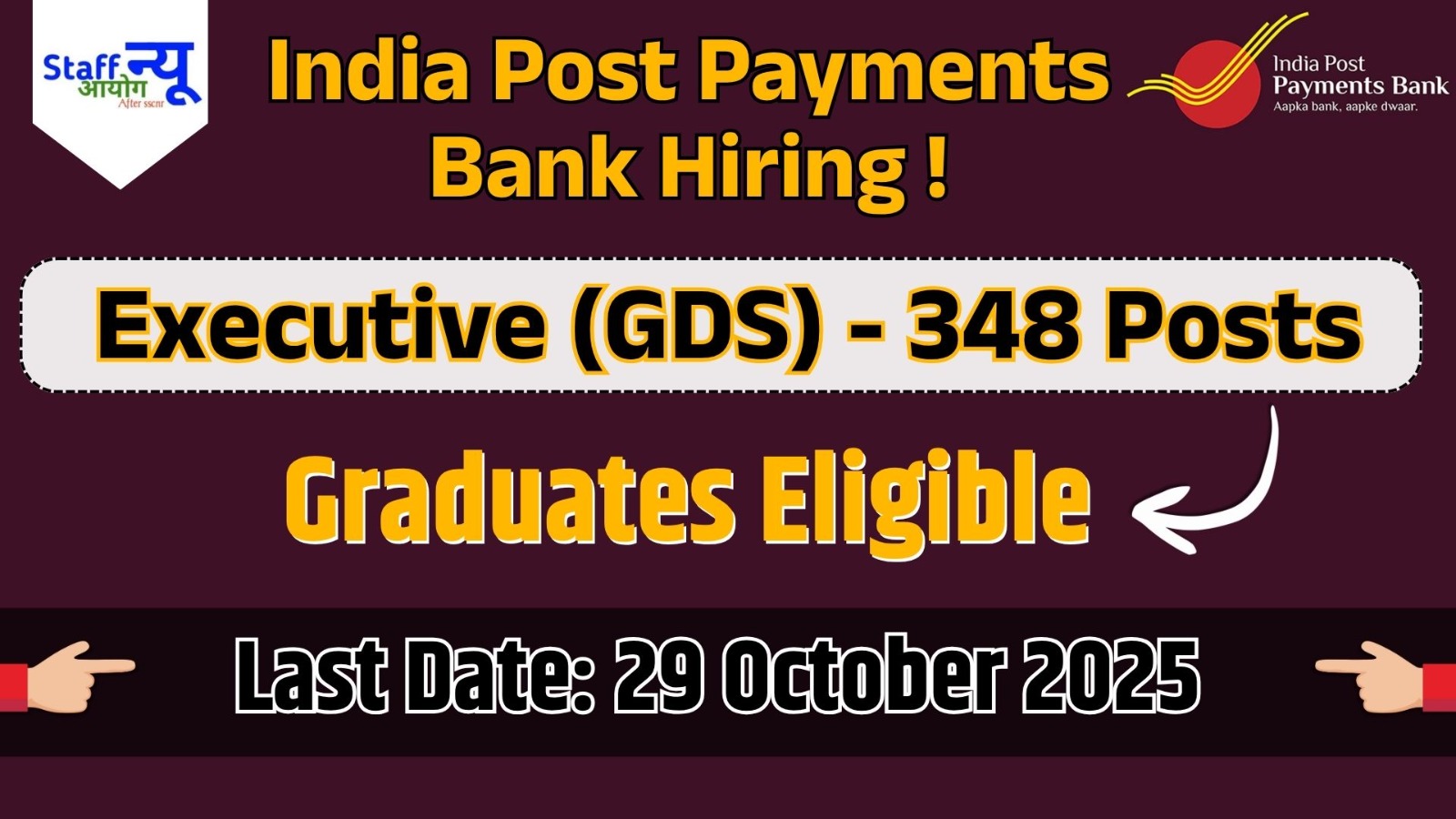 India Post Payments Bank (IPPB) has released a notification for recruitment of 348 Gramin Dak Sevaks (GDS) – Executive positions. Eligible graduates can apply online from 09 October 2025 to 29 October 2025 via the official IPPB portal.